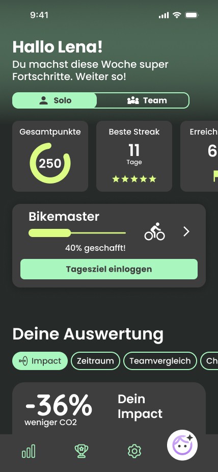 Die Anwendung motiviert Mitarbeitende sich nachhaltiger im Arbeitsalltag zu bewegen, indem es Nachhaltigkeits-Challenges spielerisch integriert, persönliche Fortschritte transparent macht.