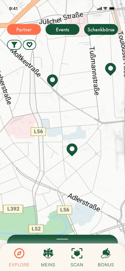 Die Karte bietet einen Überblick über alle Partnerangebote und fungiert zugleich als Startscreen.